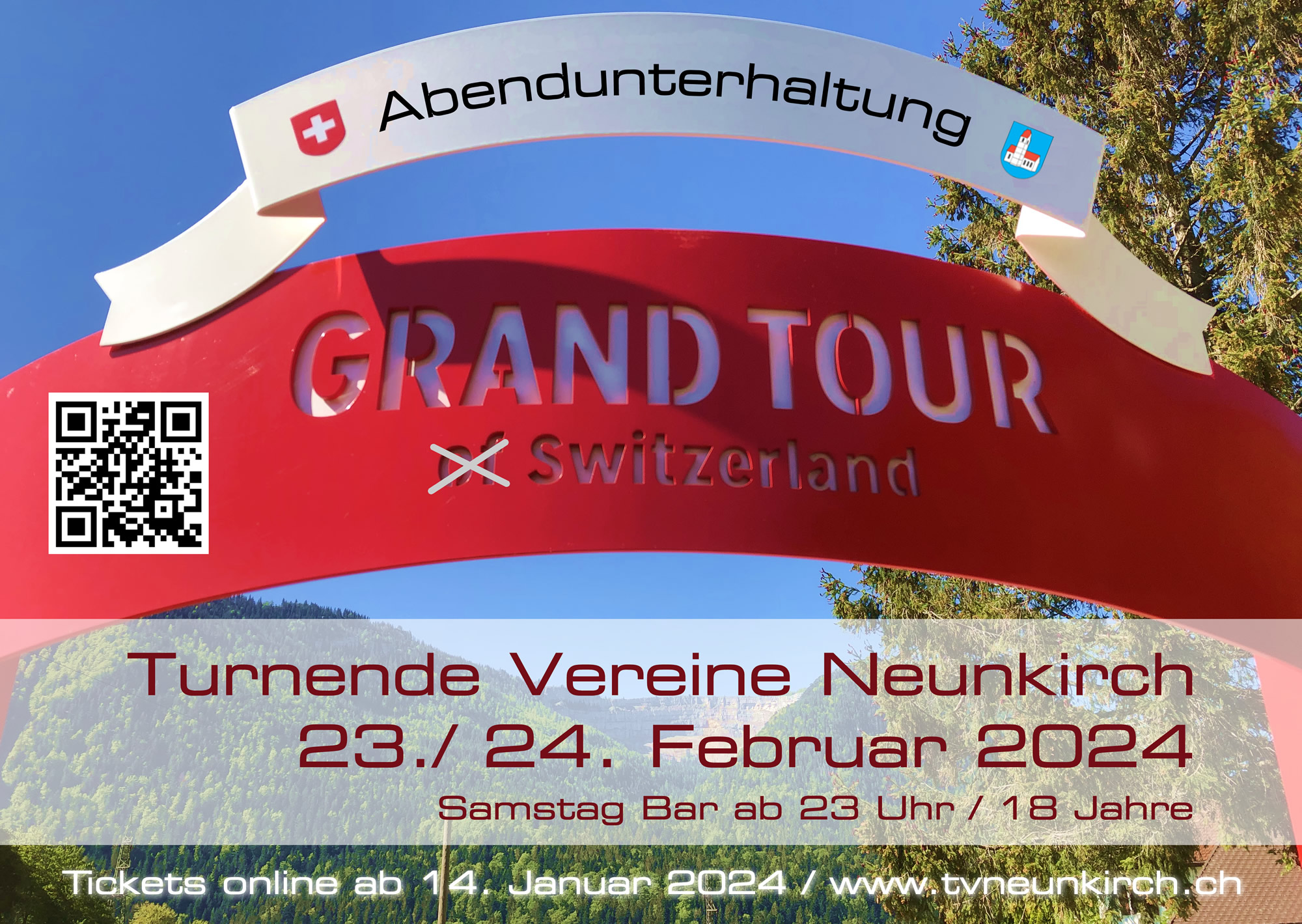 Eine Herausforderung, wie sie die Turnenden Vereine Neunkirch in über 130 Jahren noch nie zu bewältigen hatten: «GRAND TOUR Switzerland», eine Rundfahrt mit dem Velo rund um die Schweiz. Sprachprobleme, Sitzbeschwerden, technische Defekte, Wetterkapriolen und die steilen Strassen der Schweizer Bergwelt stellen sich unseren tapferen RadlerInnen in den Weg. Werden alle Teilnehmenden die Rundfahrt erfolgreich beenden können? Erfahrt es live an den beiden sportlich unterhaltsamen Abenden der Turnenden Vereine Neunkirch.